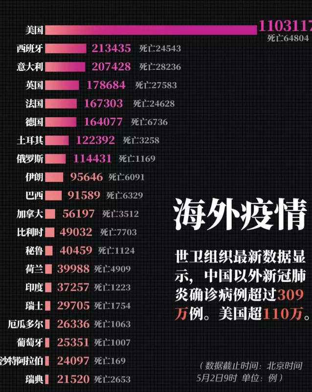 根據約翰斯·霍普金斯大學數據,截至美國東部時間5月1日19時32分,美國新冠肺炎累計確診病例1102679例,死亡64789例。美國總統特朗普5月1日再次重申,希望美國新冠肺炎死亡人數控制在10萬人以內。