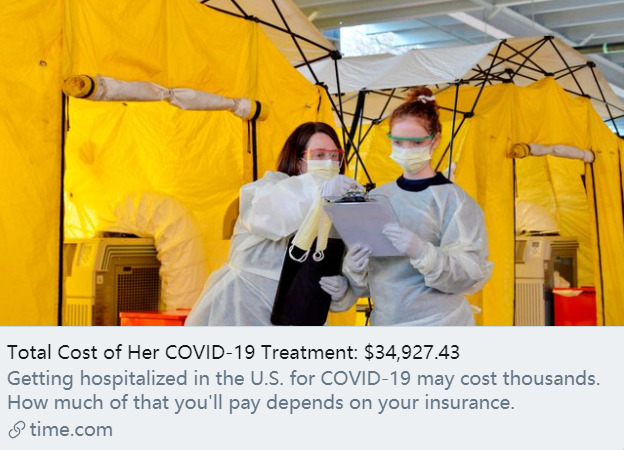 不過,美國衛生政策分析組織KFF在3月份發布這份數據似乎還有些“過時”。隨著美國確診人數不斷提升,醫療資源變得越發緊缺,各醫院“坐地起價”的事情時有發生。4月26日,美國非營利組織“公平健康”最近公布的一項調查,新冠疫情的治療費用已經攀升至2.19萬美元至7.33萬美元不等。也就是說,在不同的州通過不同的治療手段,患者很可能要為此背負上接近51萬人民幣的巨額費用。
