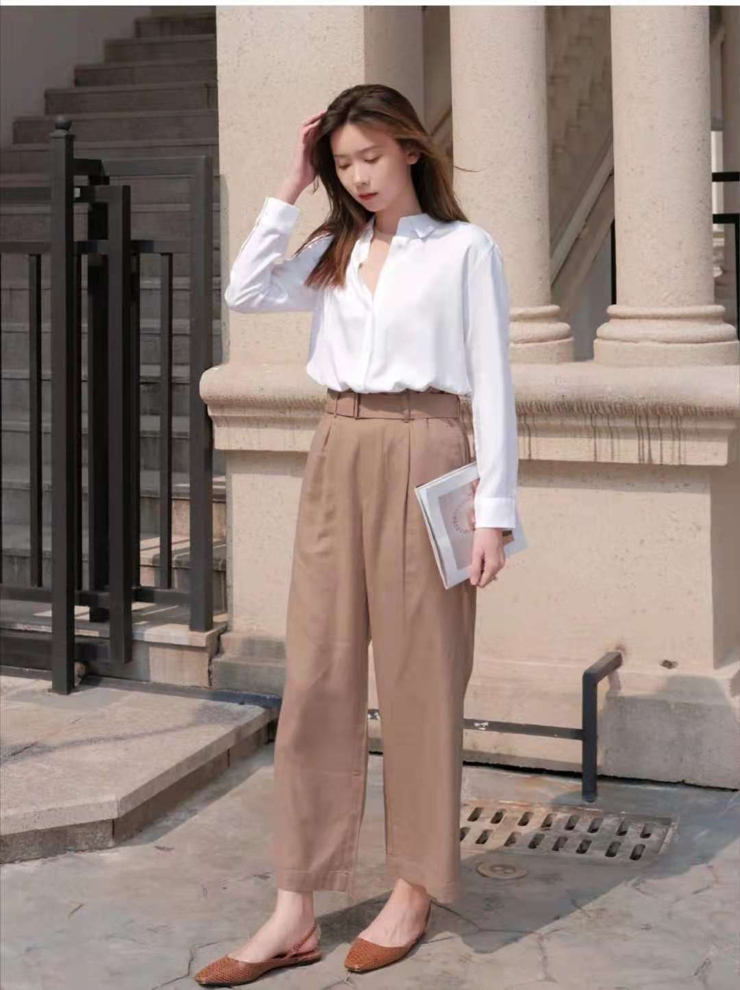 look9 白色襯衫+卡其色寬腿褲