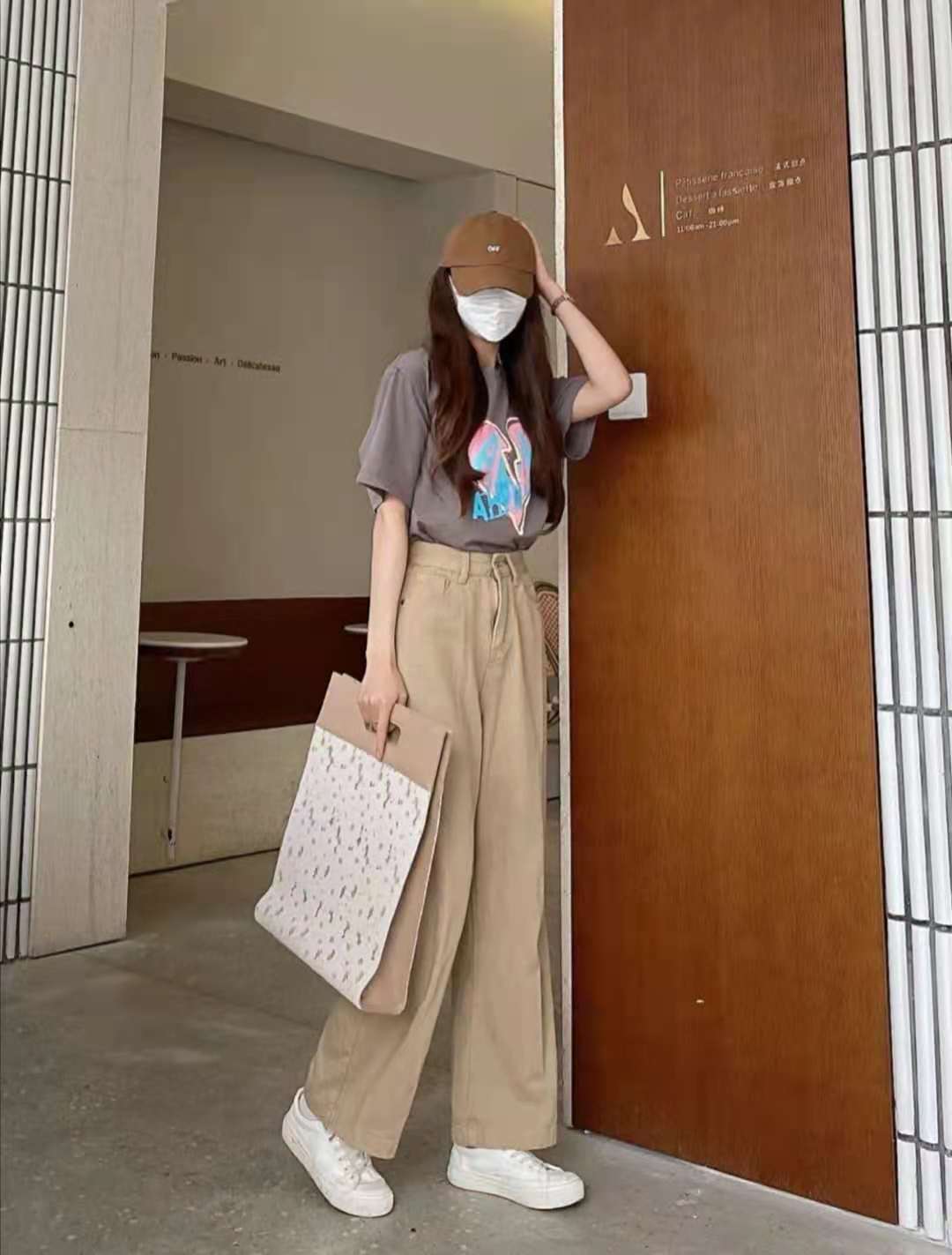 look1 灰色T恤+卡其色闊腿褲+白色帆布鞋