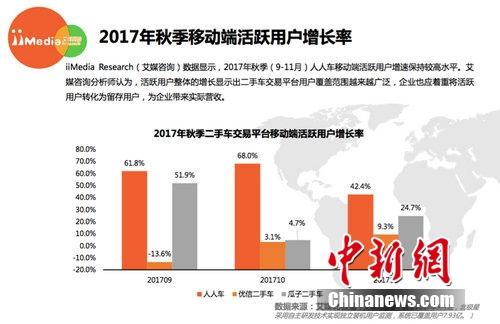 隨著市場規模的擴大,人人車也在多方面呈現出迅猛增長的態勢,牢牢鎖住頭部陣營席位。其中,2017年秋季,人人車移動端活躍用戶增速保持較高水平,位居行業第一,大幅領先第二名優信二手車、第三名瓜子二手車。