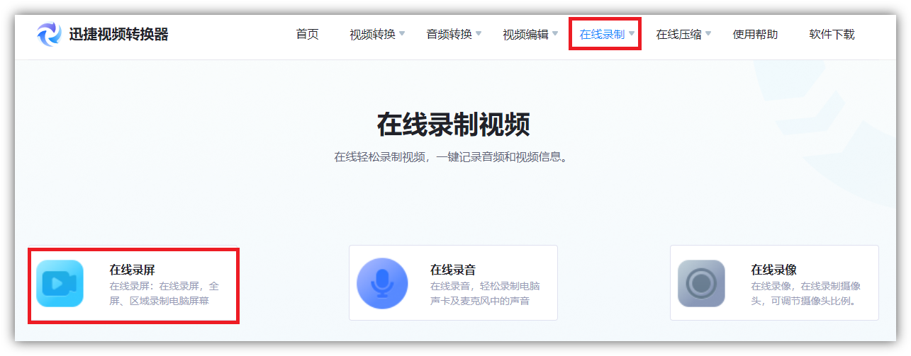 1.只有office2016版本以上才支持PPT錄屏,如果你的版本太低了,可以進行在線錄屏,打開迅捷視頻轉換器在線網站,找到【在線錄制】,選擇【在線錄屏】。