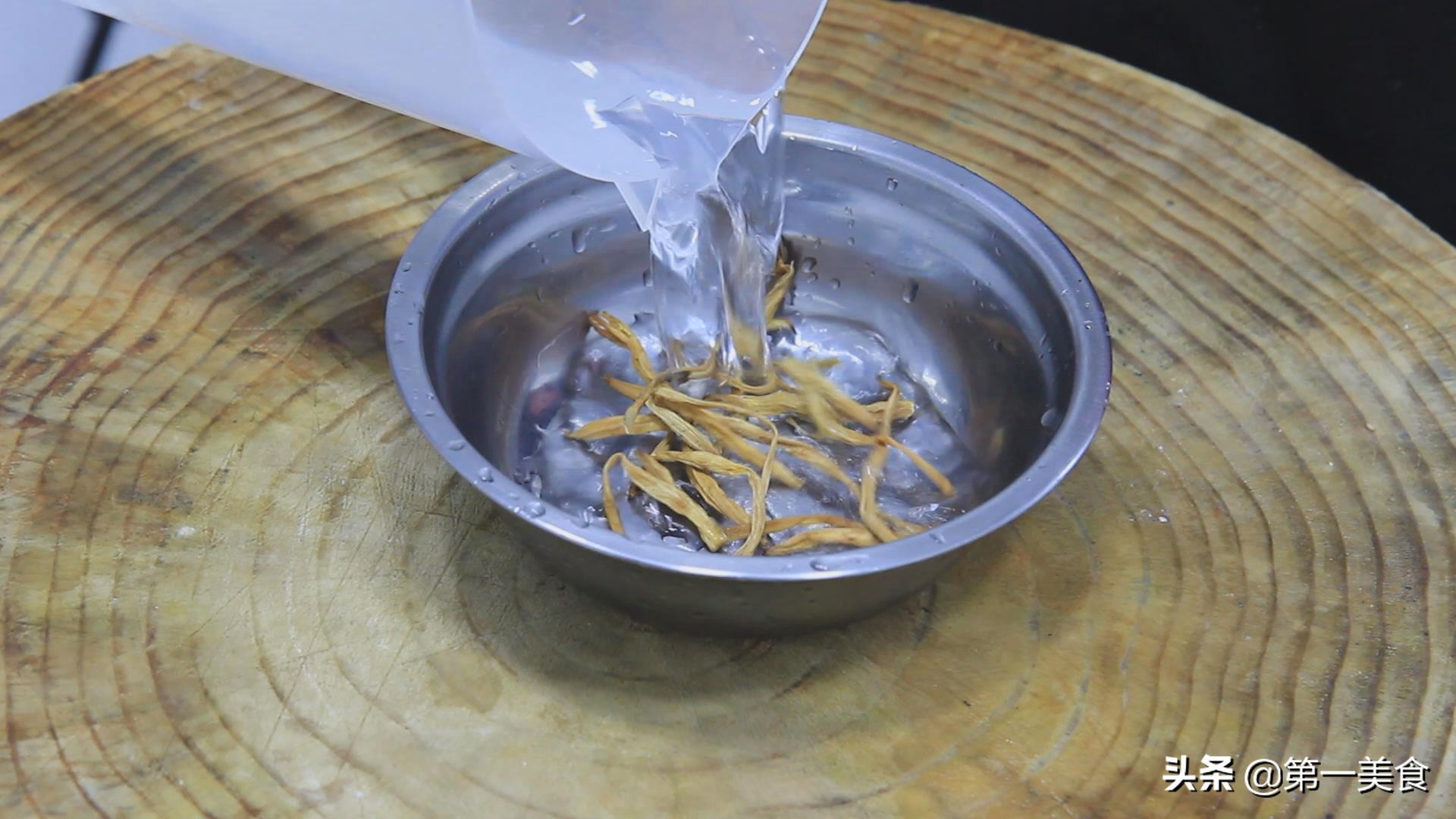 首先我們準備一下食材:干黃花菜8克,用涼水泡發后。