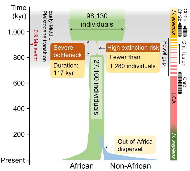 這一嚴重的遠古群體瓶頸,恰好與非洲人類祖先化石的缺失環節、非洲直立人(Homo erectus)化石的消失、新的古人類物種(LCA)的形成、兩條古人類2號染色體的融合階段相對應(圖2),進一步說明早、中更新世過渡期嚴重的群體瓶頸對人類進化具有關鍵影響,可能決定了現代人類許多關鍵表型的形成。并且,這一遠古時期群體數量的衰減,降低了65.85%現代人群的遺傳多樣性,對人類生命和健康產生了深遠的影響。