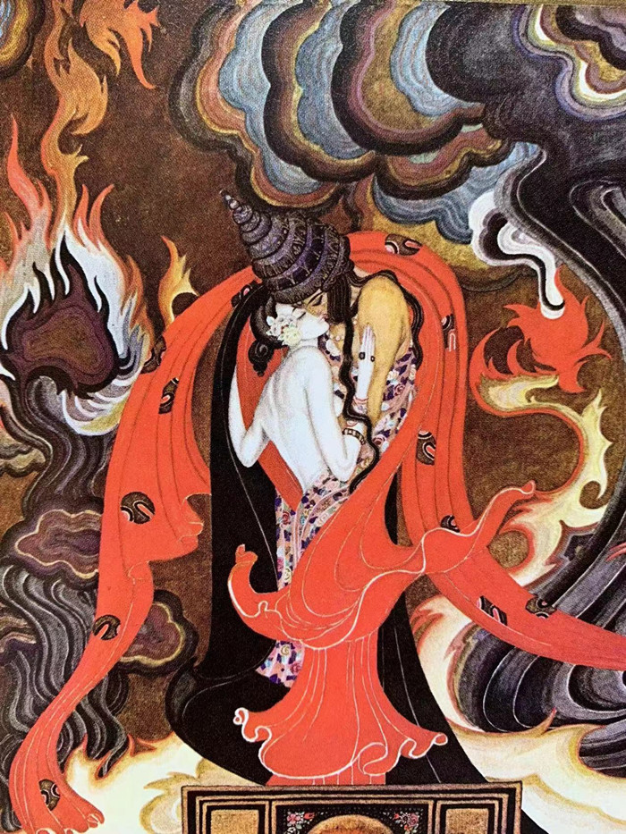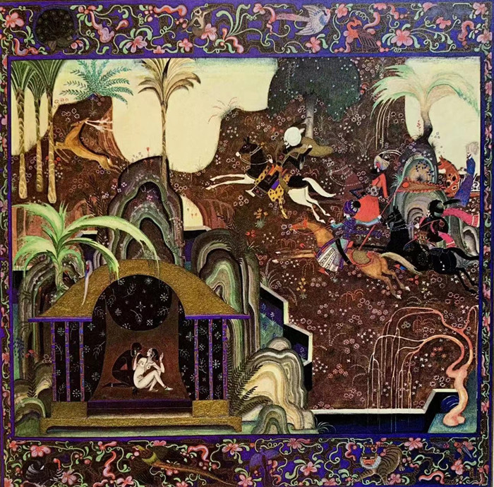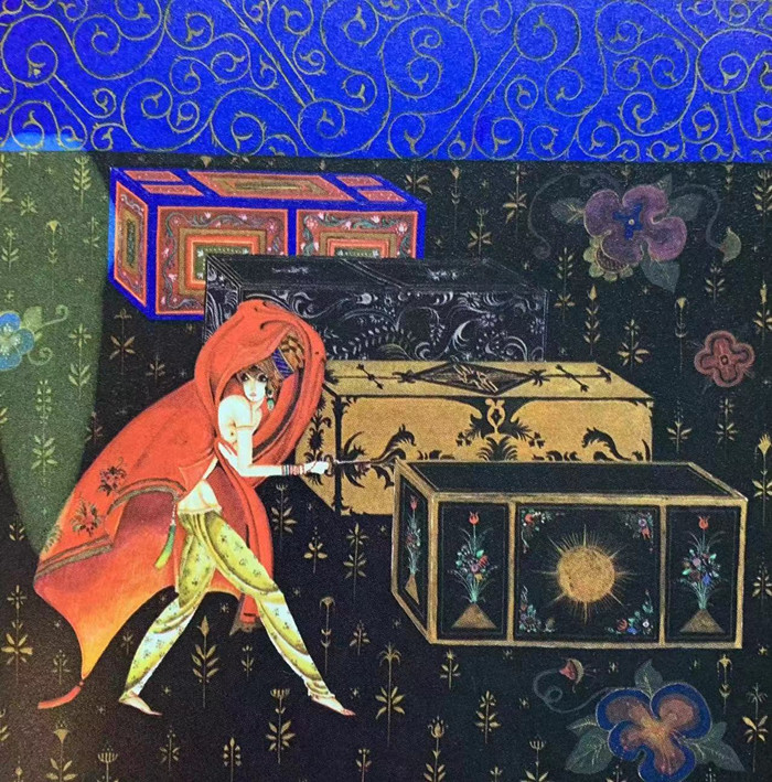 在他去世20年后,他為《一千零一夜》繪制的這組插畫才得以出版。他的作品中滿了深藍色、紅色和金箔色,鮮艷華麗,喚起了這本編纂于8世紀到13世紀之間的民間故事集的所有魔力。