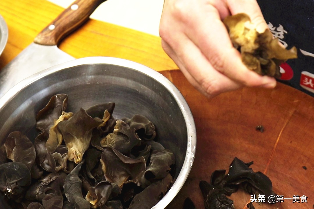 2.提前泡發的木耳,去除硬根后撕成小朵。