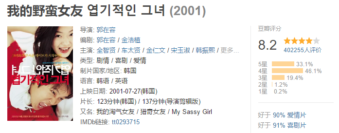 當年特別喜歡這部電影,看了好幾遍,喜歡全智賢干凈純真的長相;全片除了獨樹一幟的野蠻搞笑,還有純凈的愛情,不管在什么時候都令人向往,懷念那個時候的青春,有個人陪自己做些傻傻的事情是多么難得。
