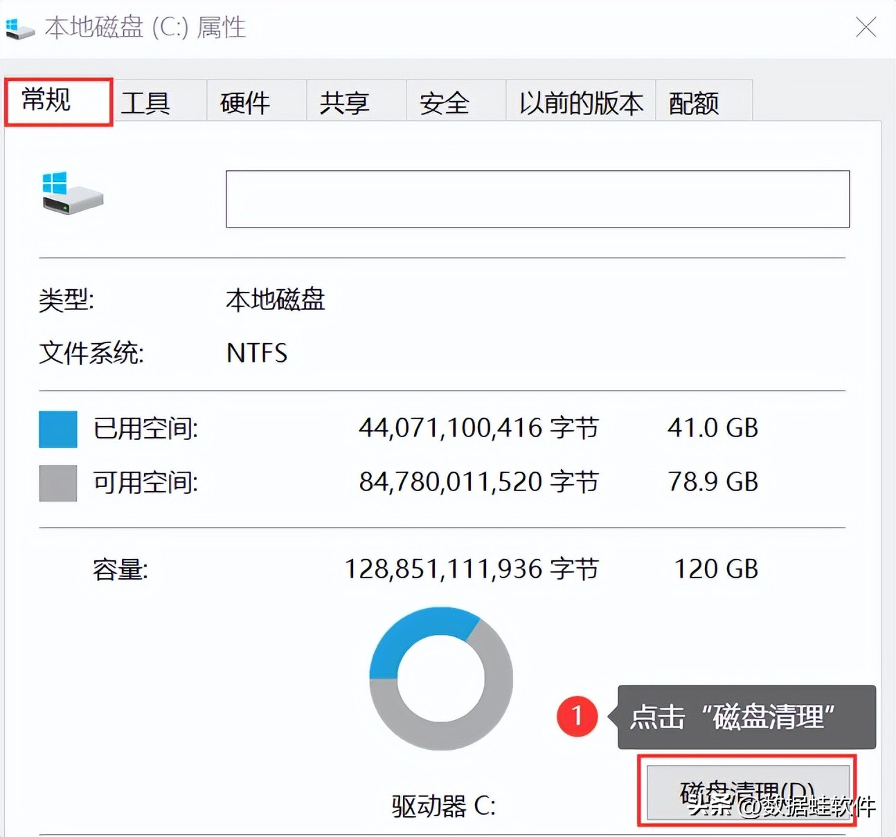 - 點擊進入【此電腦】,找到要清理磁盤的盤符(此處以c盤為例)并右鍵單擊它,選擇【屬性】,在【常規】選項卡中找到【磁盤清理】;