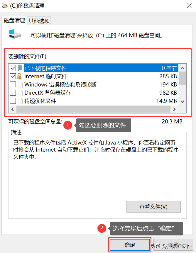 2.在【磁盤清理】中勾選要刪除的文件后點擊【確定】。