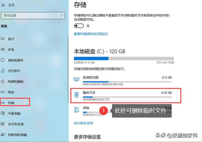 - 在界面中找到【存儲】并點擊右側【臨時文件】,選擇要刪除的文件后刪除即可。