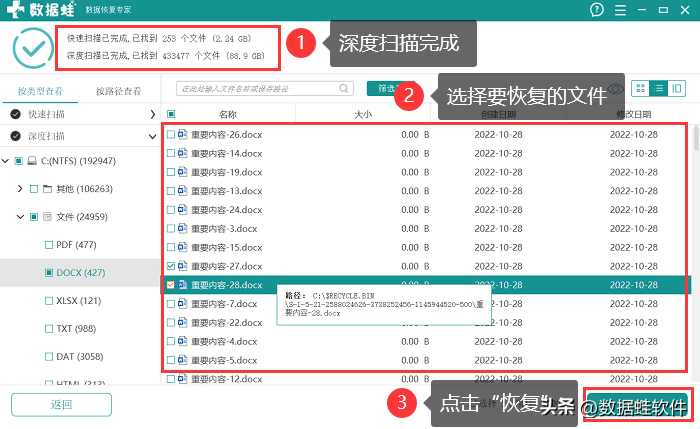 4.等待深度掃描結果,再次選擇需要恢復的文件,選擇完畢后,點擊【恢復】并在彈出的窗口中選中與掃描磁盤不同的磁盤中點擊【確定】即可。