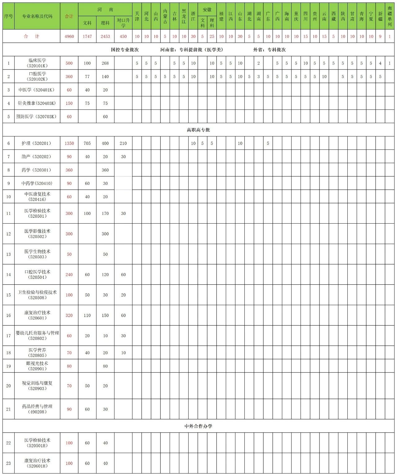 商丘醫學高等專科學校2023年普通專科(含對口升學)分省分專業招生計劃圖片