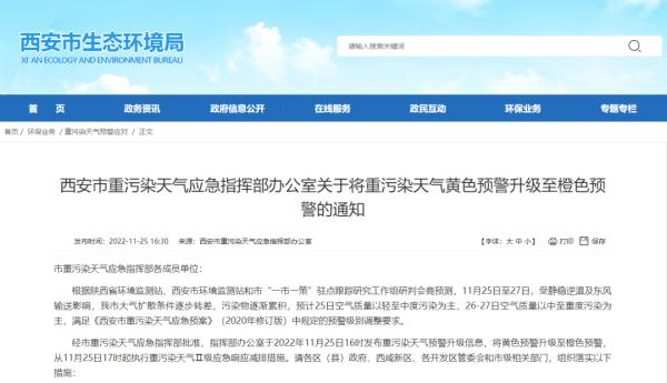 11月25日,記者從西安市重污染天氣應急指揮部辦公室獲悉,未來幾日我市空氣質量以中至重度污染為主,我市于11月25日16時發布重污染天氣預警升級信息,將黃色預警升級至橙色預警,自11月25日17時起執行重污染天氣II級應急響應減排措施。