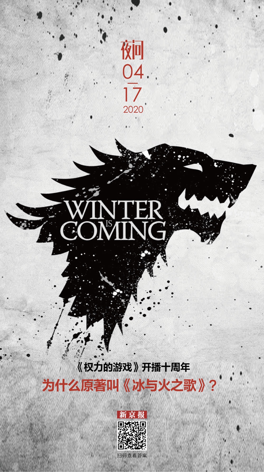 2011年4月17日,劇集《權力的游戲》第一季首播,該劇以美國作家喬治·R·R·馬丁的奇幻巨作《冰與火之歌》為基礎改編創作,全書共七卷,目前出版五卷,每卷的卷名分別為《權力的游戲》《列王的紛爭》《冰雨的風暴》《群鴉的盛宴》《魔龍的狂舞》。劇集《權力的游戲》的名字就來自系列小說的第一部。