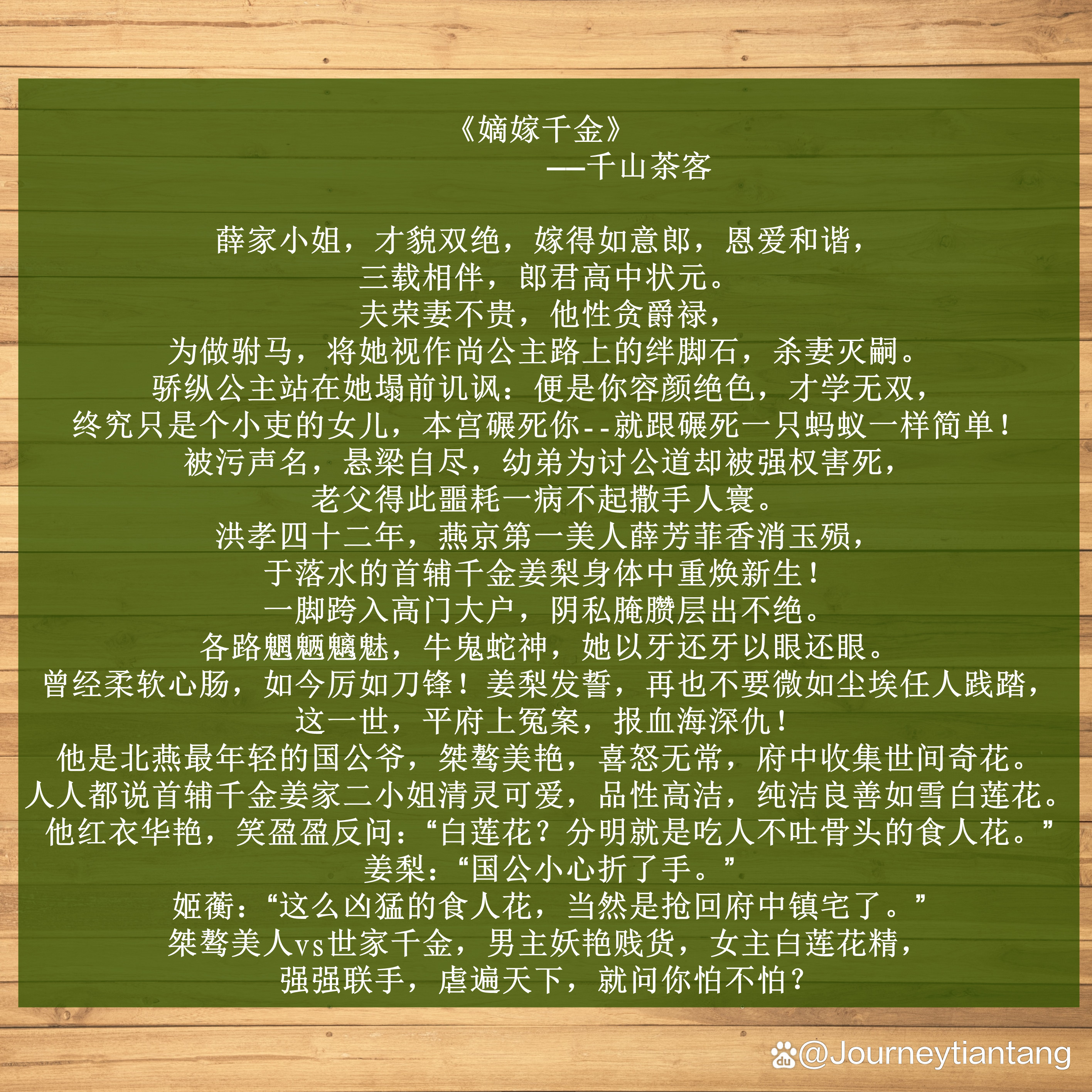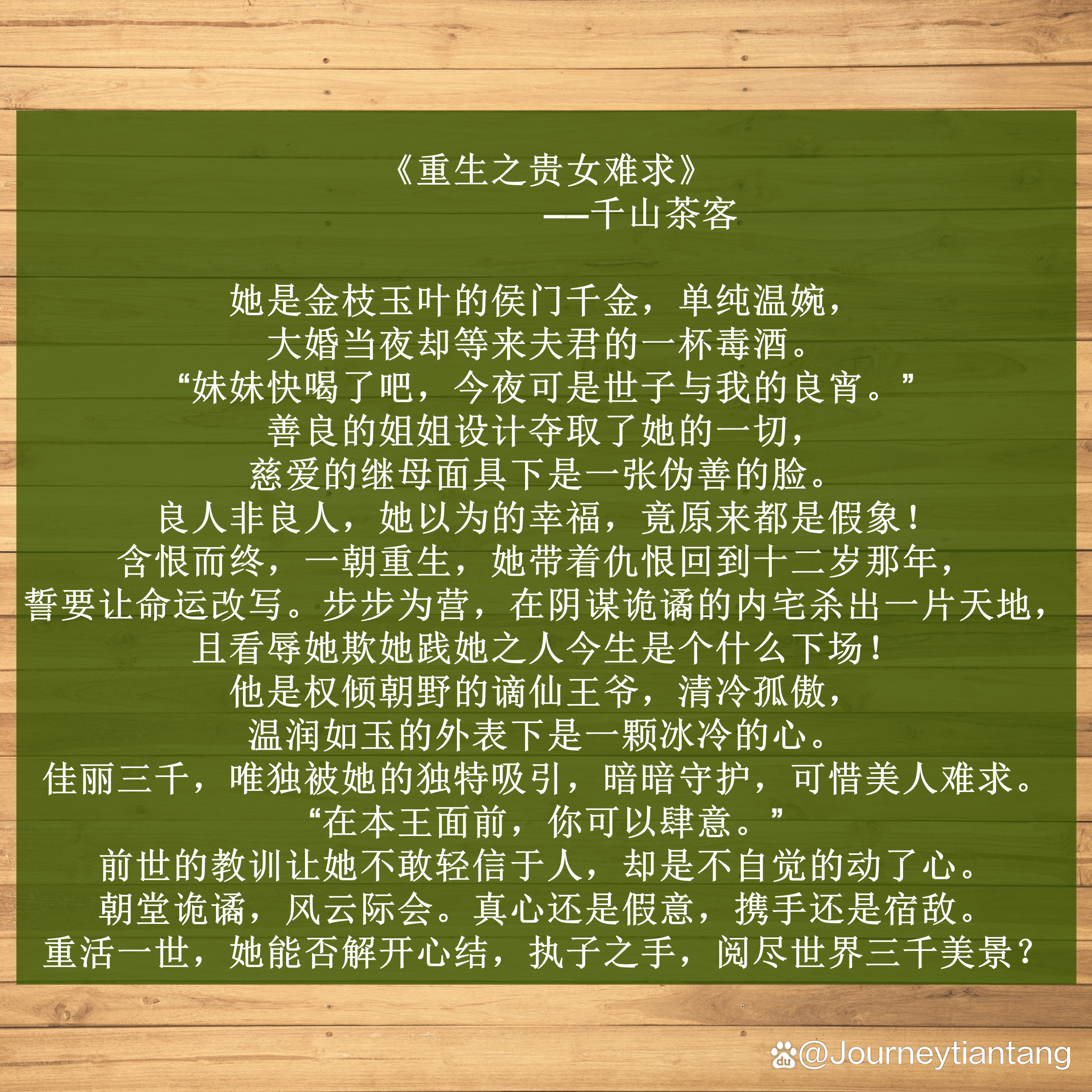 推語:千山茶客比較早期的作品,從現在的角度來看,文筆略顯幼稚,情節也有一些小白,屬于比較初級的作品,女主前世傻白甜,以為繼母和繼姐對自己非常好,新婚之夜卻被設計而死,原來她所看到的一切都是假象,人生重來,她擦亮自己的雙眼,才發現原來自己的身世另有秘密……男主性格塑造得比較成熟,對比還挺明顯的,喜歡宅斗文的,可以讀一讀。