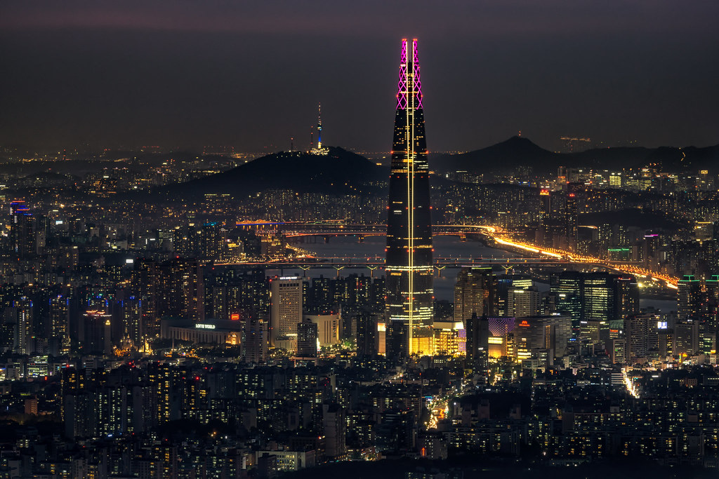 首爾的城市天際線可以說是獨樹一幟,它以世界第4高樓——樂山世界塔(554.5米)為最高點,與周邊一兩百米高樓形成巨大的落差。