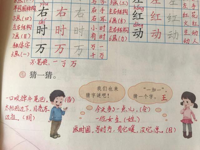 課后只有一道習題是:猜一猜,讓孩子們繼續猜謎,一加一猜一個字,謎底是王。