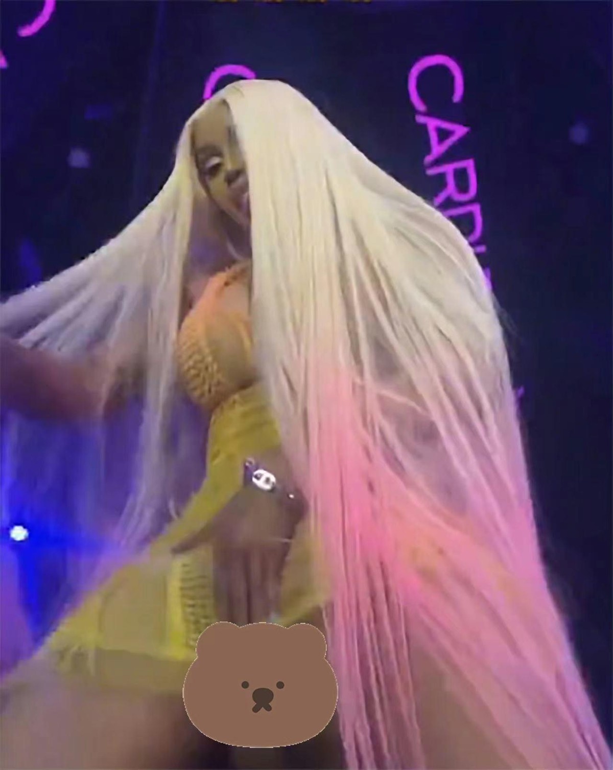 Cardi B在舞臺上,眼神迷離又挑逗,一條黃色短裙遮不住秘密花園,隨著音樂舞動的她沒有注意到自己的衛生棉條也正在不斷搖擺,這一畫面簡直可以當選本年度最辣眼畫面第一名。