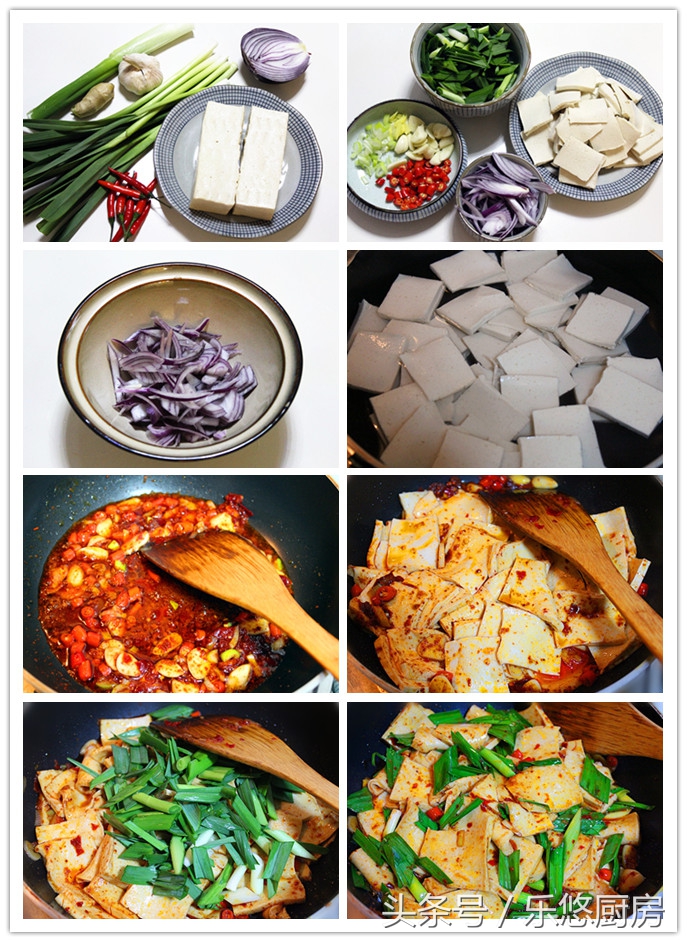第二步:將千葉豆腐切成片、青蒜苗切段、洋蔥切絲、紅辣椒段切、蔥姜蒜切末備用。