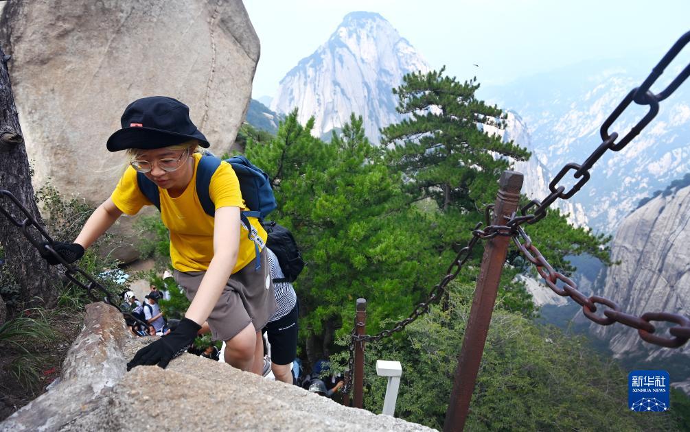 導讀游客在華山北峰金鎖關游覽。進入暑期旅游旺季,位于陜西省渭南市的西岳華山迎來五湖四海的游客。據了解,自7月以來,華山景區日均游客接待量已超過2萬人次。新華社記者 劉瀟 攝游客