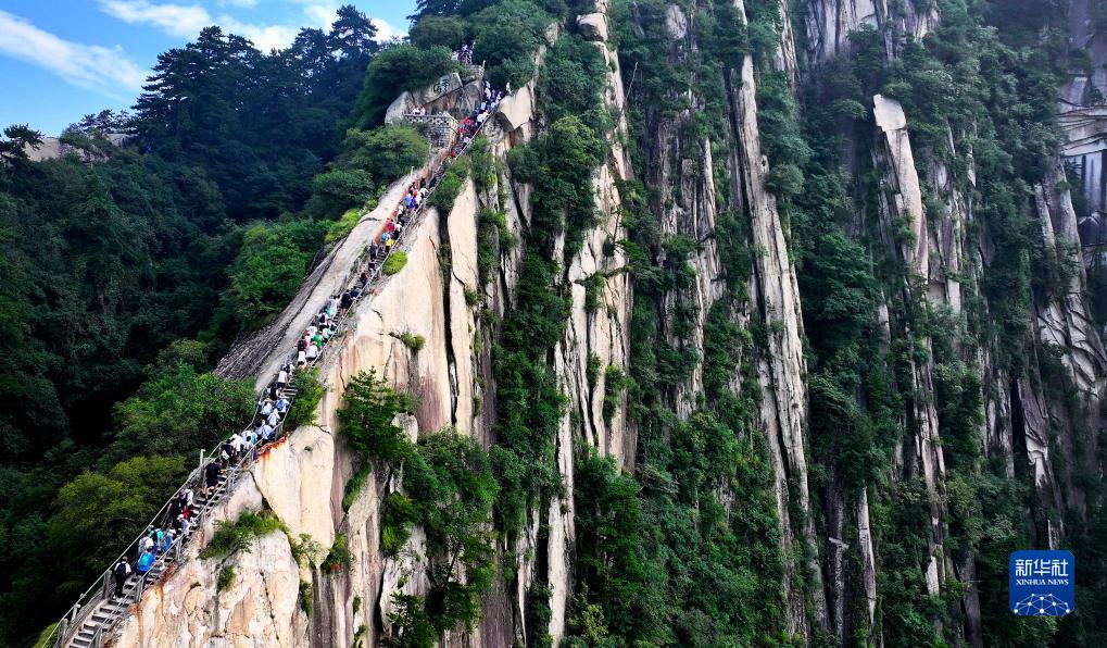 游客在華山北峰排隊前行(8月10日攝,無人機照片)。