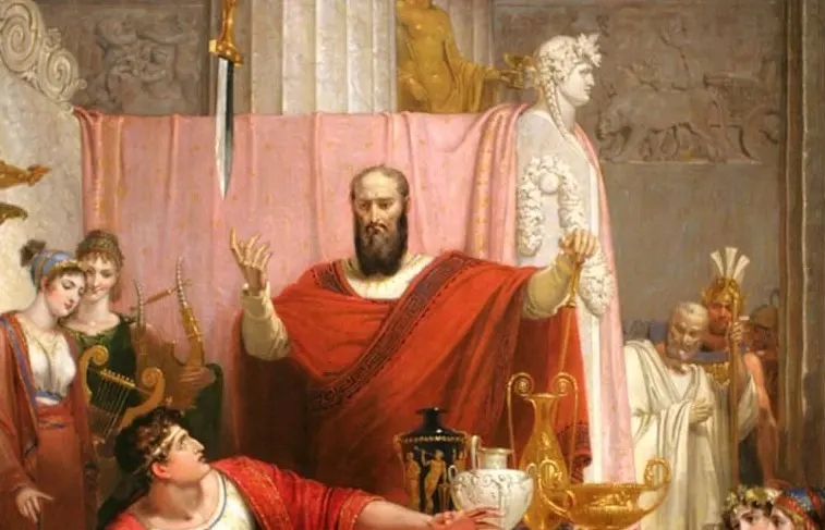 達摩克里斯是公元前4世紀意大利敘拉古的僭主狄奧尼修斯二世的朝臣,他非常喜歡奉承狄奧尼修斯。他奉承道:作為一個擁有權利和威信的偉人,狄奧尼修斯實在很幸運。狄奧尼修斯提議與他交換一天的身份,那他就可以嘗試到首領的命運。在晚上舉行的宴會里,達摩克里斯非常享受成為國王的感覺。當晚餐快結束的時候,他抬頭才注意到王位上方僅用一根馬鬃懸掛著的利劍。他立即失去了對美食和靚女的興趣,并請求僭主放過他,他再也不想得到這樣的幸運。