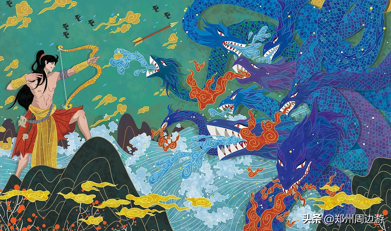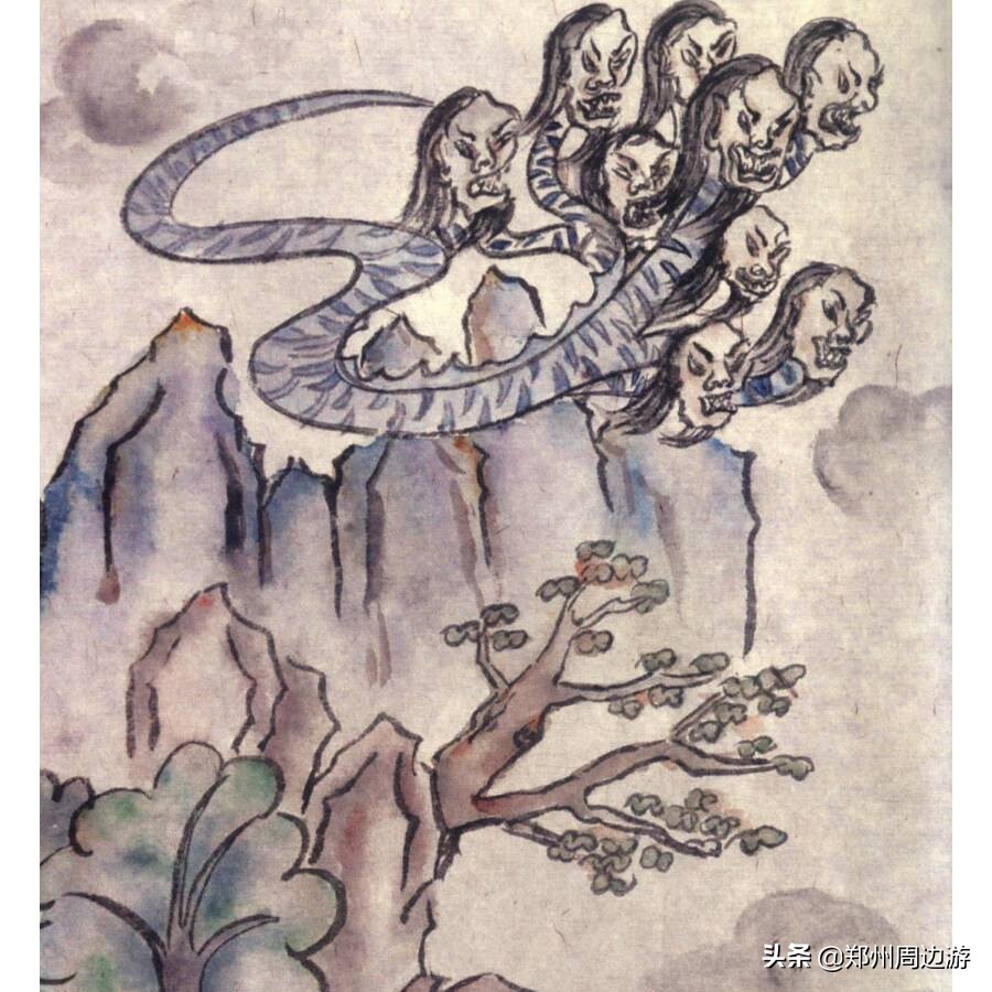 這一天,到了西方頂天柱——不周山下。前邊有大山攔路,后邊是祝融噴火追來,共工走投無路,一頭撞在不周山上,只聽“轟隆”一聲巨響,大地抖了幾抖,西方的天塌下來了。頃刻問,殘片碎石填滿了大河。填滿了大海。海和河里的水,奔騰咆哮著涌向東方。一時三刻,中天鎮變成了一片黃湯。