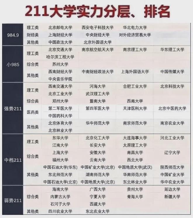 由于211大學數量眾多,其實力存在一定差異。按照一般認知,可以將211大學的實力分為三個層次: