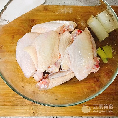 1、準備食材,雞翅洗凈,姜切片,蔥切段