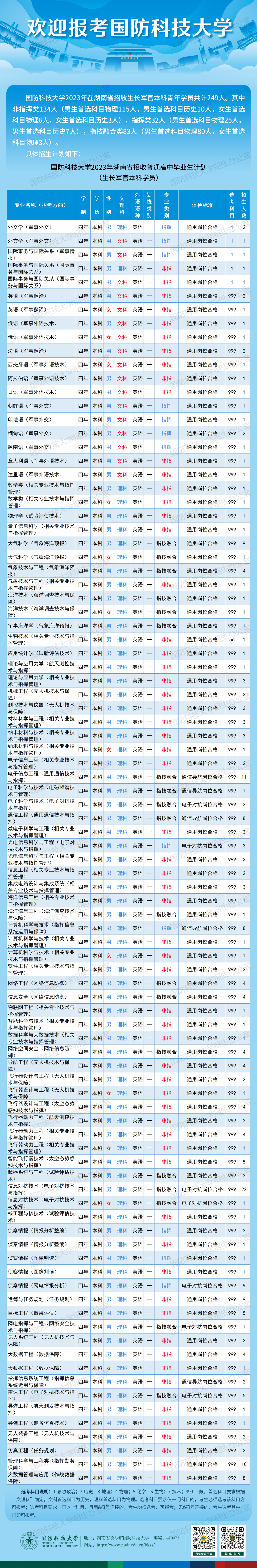 國防科技大學2023年在全國31個省份(市、自治區)面向普通高中畢業生招收2600名生長軍官本科學員,其中在湘計劃招收249名,具體請查看國防科技大學2023年招收普通高中畢業生計劃(生長軍官本科學員),