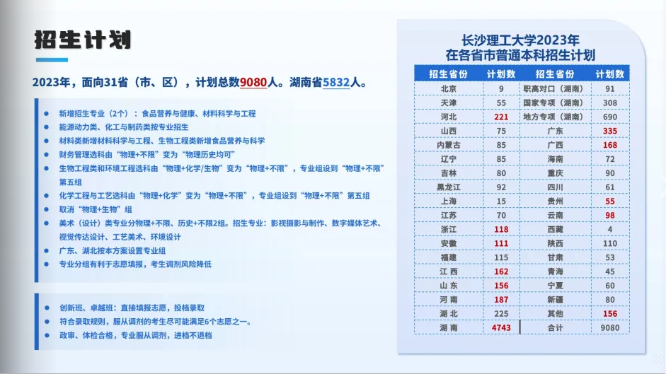 長沙理工大學2023年面向31省(市、區)計劃招生9080人,其中湖南省5832人,具體請查看長沙理工大學2023年本科招生指南《逐夢長理》,