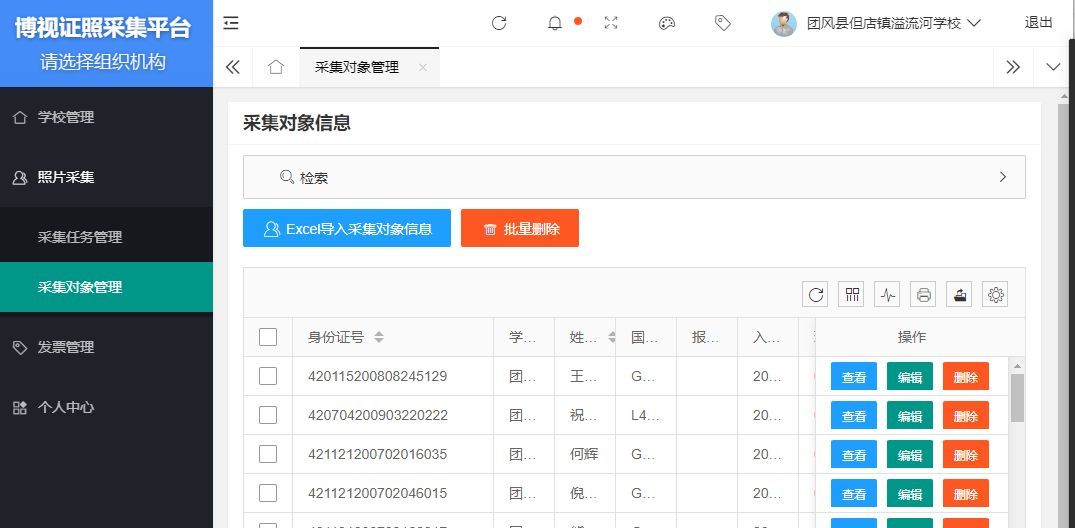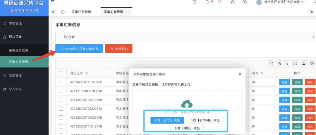 這樣做的目的是為了方便管理,例如按班級創建采集任務,并把同一個班級的學生信息導入任務中,這樣班主任就只需要關心自己班級的學生證照采集即可。后續也方便下載、統計和繳費等工作的進行。