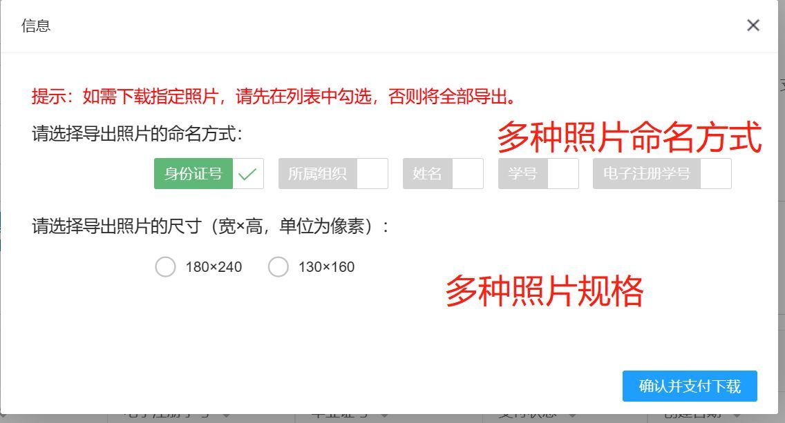 1、將采集的照片批量打包下載,可下載為《中小學生學籍管理系統》或學信網要求的照片規格或其他規格(130*150,小于10KB),并且可以選擇豐富的照片文件自動命名方式組合,例如學籍號+姓名。
