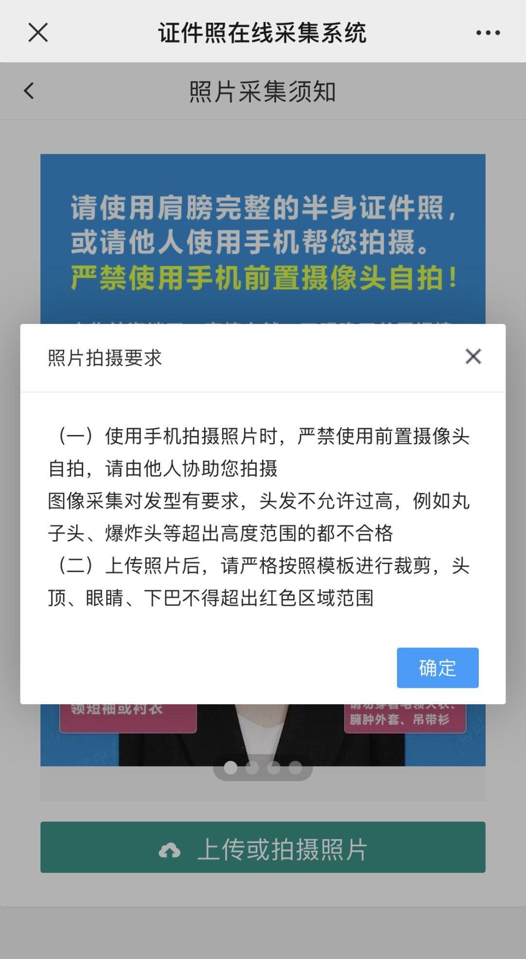 點擊下方“上傳或拍攝照片”按鈕,之后可以使用照相機拍照,或從手機相冊中上傳已有照片(不在校學生可上傳已有照片,系統會自動處理成標準規格)。
