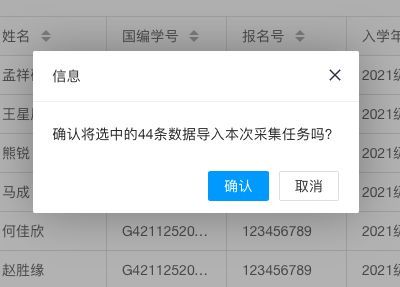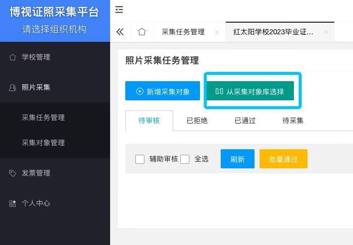 進入采集任務中,例如“2020級畢業證照片采集”這個任務,找到“從采集對象庫選擇”按鈕,即可看到全校學生的數據,搜索找到2020級學生,全選并導入即可。