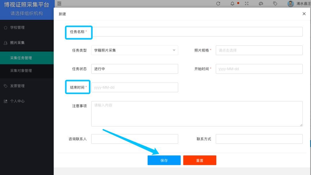 點擊左側“新建照片采集任務”按鈕,彈出“新建”任務窗口,按文字說明填寫相關信息,帶*號的為必填選項。填寫完畢后,點擊保存,即可生成采集任務。