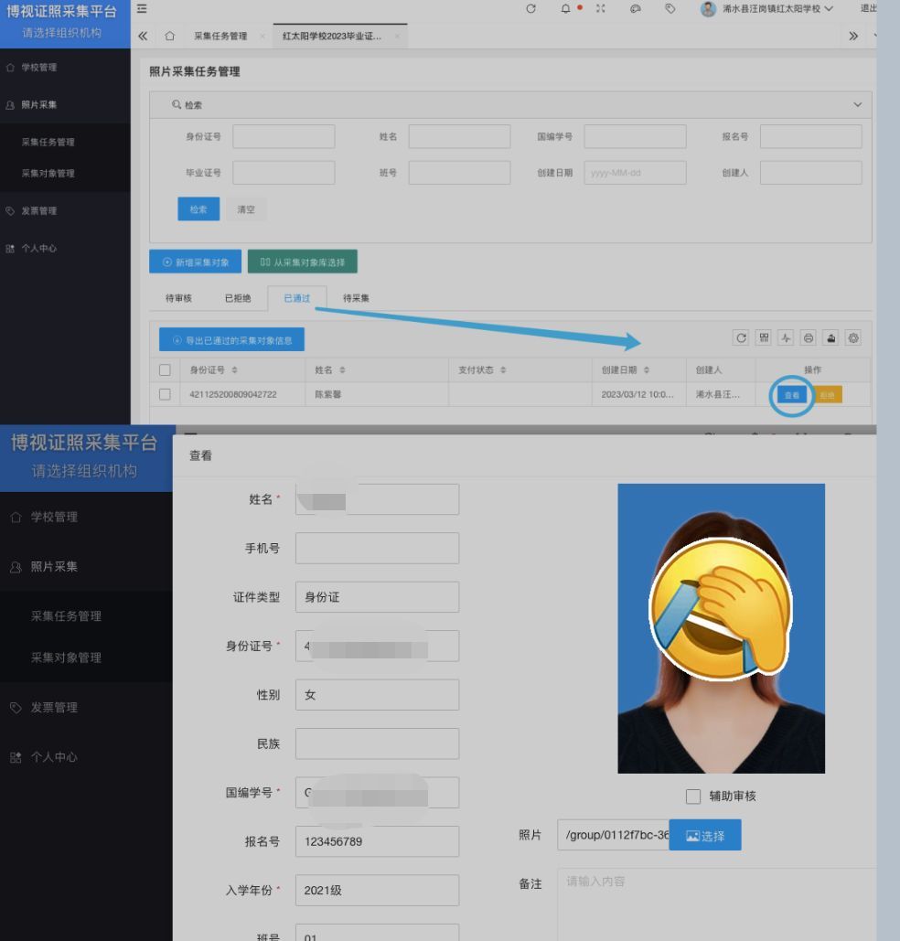 各班主任完成采集任務后,學校管理員可在后臺任務列表中點擊“查看”按鈕,即可看到當前已經提交的照片。