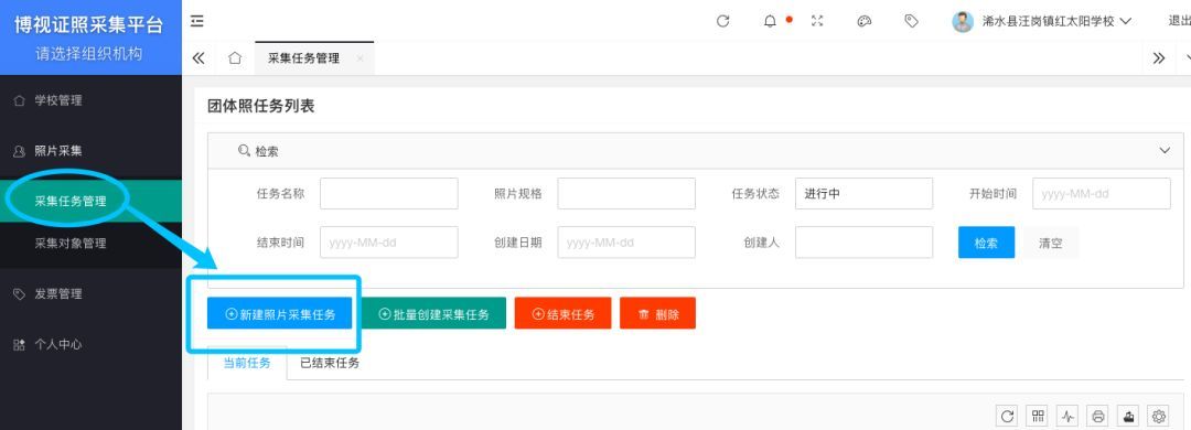 點擊左側菜單中的“照片采集管理 >采集任務管理”,即可看到當前正在進行的采集任務。