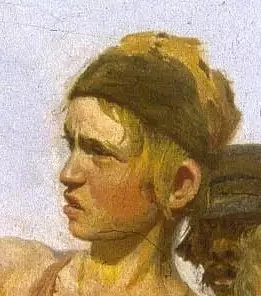 中間一組也是四個人:穿一身粉紅色破衫褲的少年名叫拉里卡。看來這個少年是初加入這支行列,他那還未曬黑的皮膚,緊蹙的眉頭告訴觀者,這種勞動對他來說是負荷過重了。他正用于在調節壓在自己肩頭那根據痛了皮膚的纖索。畫家在這個新的受壓迫者身上似乎要找到一種希望,那就是不甘心受剝削,要反抗。令人注目的是,在這個少年頸上還掛著一只十字架,這是父母給孩子的信物,祈求上帝能保佑他路上平安。列賓為畫這個少年纖夫,曾從他熟悉的孩童形象中挑選了一個作模特兒。少年拉纖這種現象,也如資本家利用童工榨取勞力一樣殘酷,這是沙皇俄國的農奴制度的罪惡,也是畫家所要抨擊的主要目標。緊靠在拉里卡后面的,是一個受盡風霜之苦的禿頂老漢,他皮膚助黑, 臉色陰沉,一邊斜倚在纖索上,一邊在打開自己的煙袋,想偷閑抽口煙來緩解一下自己的苦悶。他和前面的少年, 在色彩上構成了強烈對比。兩代人,不同的命運,卻系在一根繩索上。少年右邊是個羸弱有病的纖夫,他步履艱難,全身虛弱,正在用袖口擦汗。頭發露在無檐帽的外邊,顴骨聳起,淚囊水腫,他未來的路程意味著更 大的厄運,我們似乎可以聽到他那急促的喘息。在拉里卡與老漢之間,露出了另一個纖夫的腦袋頂,此人的臉龐發黑,鼻孔朝外,嘴唇很厚,看樣子是個撻靼人。