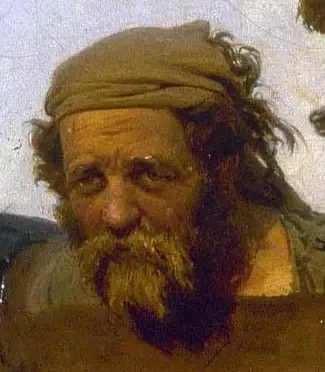 最前一組共四人,領頭的名叫岡寧,他的表情溫順,然而性格堅韌,具有一種內在的意志力,此人約有四五十歲。他那雙深陷的眼睛使他的前額更加突出,顯出了他的智慧。列賓在他的頭上添畫上一塊包頭的破布,似乎要把他塑成古希臘哲學家的樣子。他原是個神父,后來被教會革職,一度充任過教堂唱詩隊的指揮。他身體結實, 兩手下垂。胸前那一條纖索繃得很緊,而身上的麻布衫卻滿是補釘。這是一個俄羅斯農民長者或智者的典型,他忍受著肉體與精神的痛苦,是這些纖夫形象中的悲劇性主角。在他右邊的一個是身材魁梧的憨直的農民漢子,他赤著腳,頭發蓬亂,滿臉濃密的胡子,似乎在低低地向岡寧絮叨著什么。這個形象起著襯托岡寧的前傾的身子的作用。在他后面是一個細長的瘦子,年近40,身子大部分被擋住了。他頭戴麥稈帽,叼著一只土煙斗,頭顯得尖小一些。他挺直著身子,這樣可使纖索松弛,好像是想省點力氣。這個瘦子的左側,則是一個躬背彎腰的纖夫,他原來是個水手,叫伊卡爾。他的兩手向下握攏,神色嚴厲,眼神凝注,直對著前方。顯然,他的脾氣一定很倔強,是個農村硬漢子。汗水已把他的上衣腐蝕得百孔千瘡,結實的肩膀正從破洞處顯露出來。