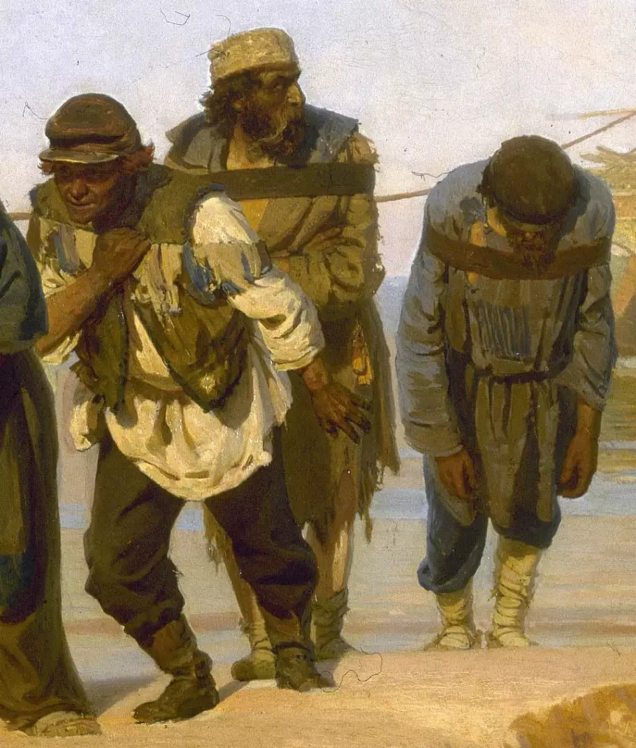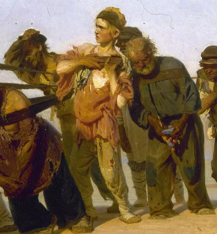 《伏爾加河上的纖夫》是列賓在19世紀80年代初創作的批判現實主義油畫中的杰作。這是畫家親眼目睹的情景,成為揮之不去的記憶,列賓決定把這一苦役般的勞動景象畫出來,狹長的畫幅展現了這群纖夫的隊伍,陽光酷烈,沙灘荒蕪,穿著破爛衣衫的纖夫拉著貨船,步履沉重地向前行進。全畫以淡綠、淡紫、暗棕色描繪頭上的天空,使氣氛顯得慘淡,加強了全畫的悲劇性。
