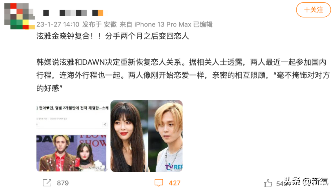 去年11月底,沒有什么預兆的突然官宣分手。中間一反常態的全黑造型出鏡,還被網友調侃“分手的泫雅最后變成了金曉鐘”。