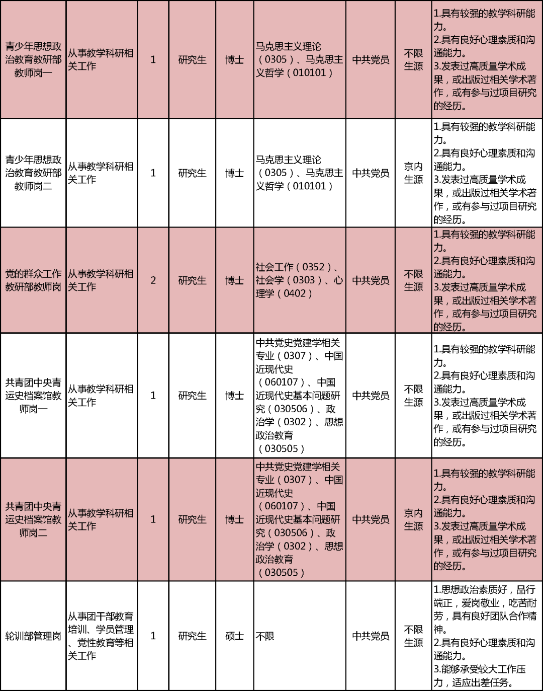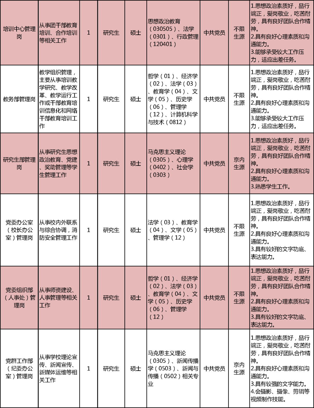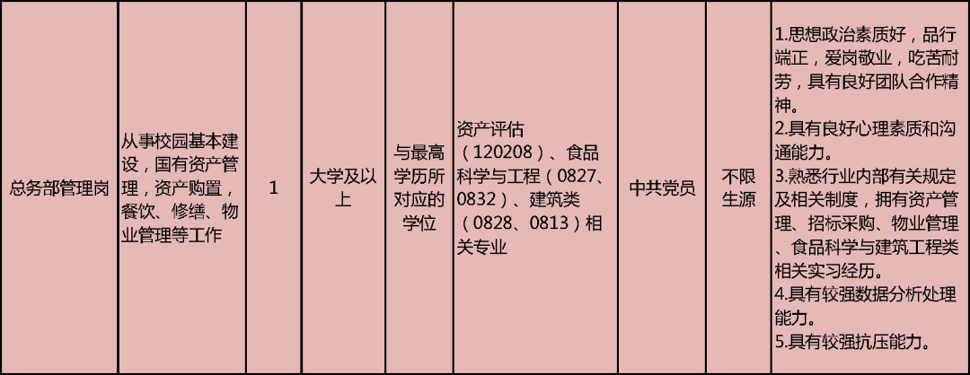 須掌握從事高校管理工作必備的專業知識和技能,具有良好的文化素養和知識結構,有較強的組織協調、團隊合作以及語言和文字表達能力;須是中共黨員或中共預備黨員,且具有學生干部經歷。