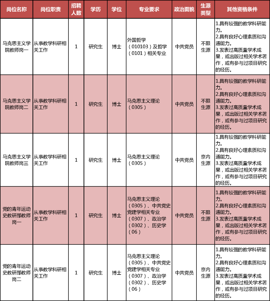 教學科研崗位、輔導員崗位、圖書資料崗位、醫療衛生崗位、會計審計崗位和附屬中學教師崗位。
