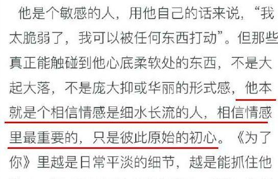 羅晉在采訪中提到自己很敏感很脆弱,可以被任何東西打動,不喜歡大起大落,相信感情細水長流,相信感情里最重要的只是彼此最原始的初心。