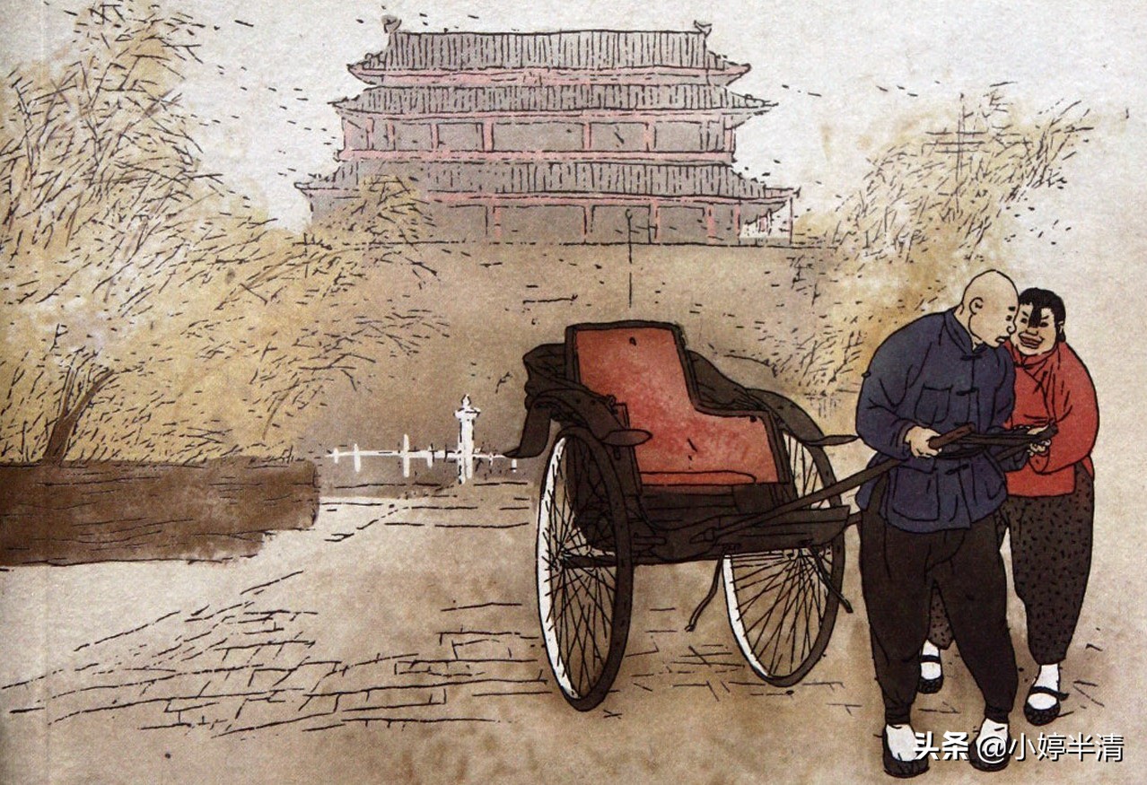 虎妞的出現把祥子帶入了苦惱之中,讓他更苦惱的是,他遇到了老馬小馬,老馬有自己的車,和孫子小馬每日奔波,卻依然貧窮,過了今天不知明天在哪,這一幕狠狠擊中了祥子的內心。
