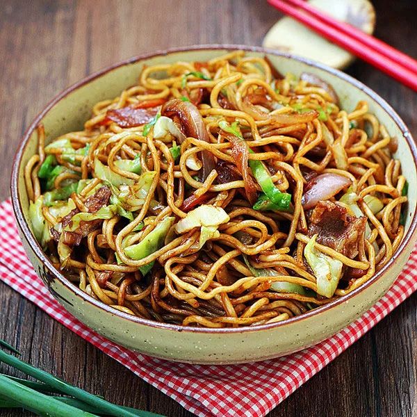 細面條、五花肉、圓白菜、胡蘿卜、洋蔥、醬油、蠔油、食鹽、料酒、香蔥。