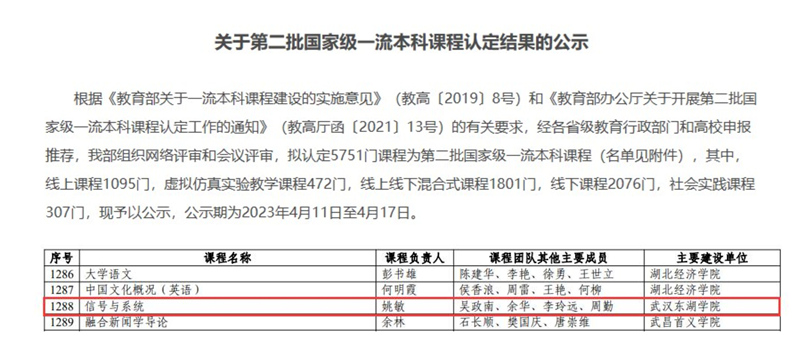 導讀近日,教育部發布《關于第二批國家級一流本科課程認定結果的公示》,武漢東湖學院電子信息工程學院《信號與系統》課程獲批國家級線上線下混合式課程,這是學校近年來在課程建設方面取得的重要成果之一。 《信號與