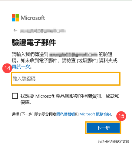 8,Microsoft將會寄一封驗證電子郵件到您的電子郵件信箱,請輸入驗證碼?,然后點擊[下一步]?。