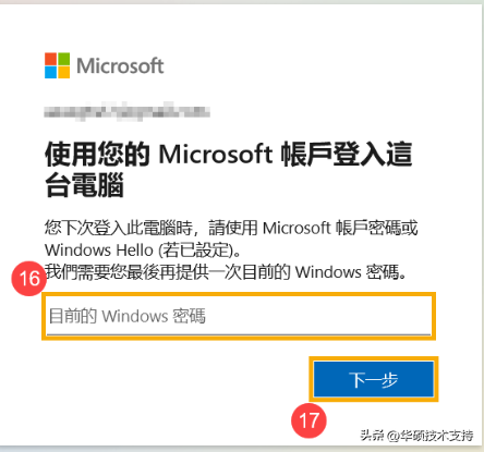 9,Microsoft賬戶建立完成,當您下次登入計算機時,將會使用Microsoft帳戶及密碼登入。在此之前,請先輸入您原本使用本機帳戶登入Windows的密碼?,然后點擊[下一步]?。
